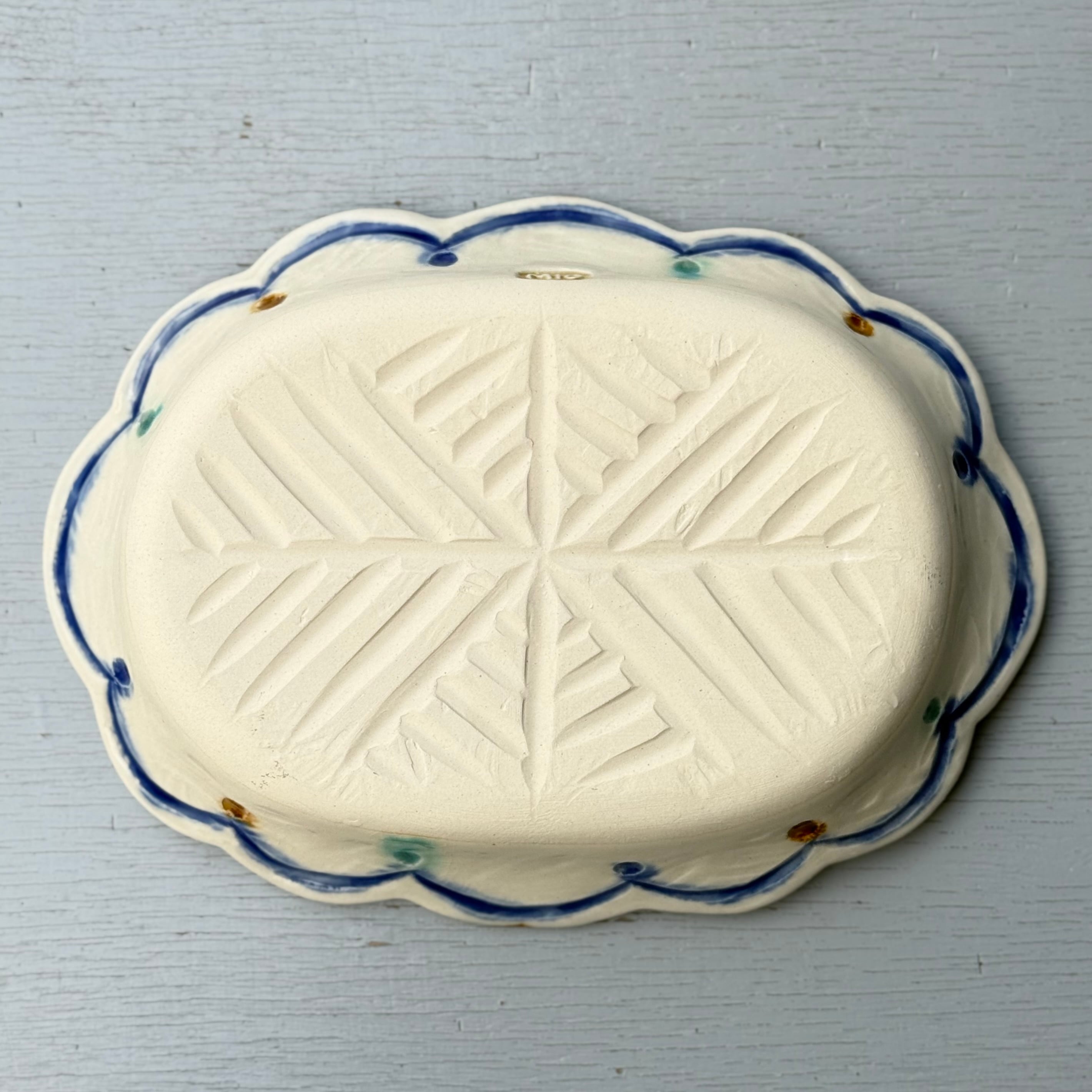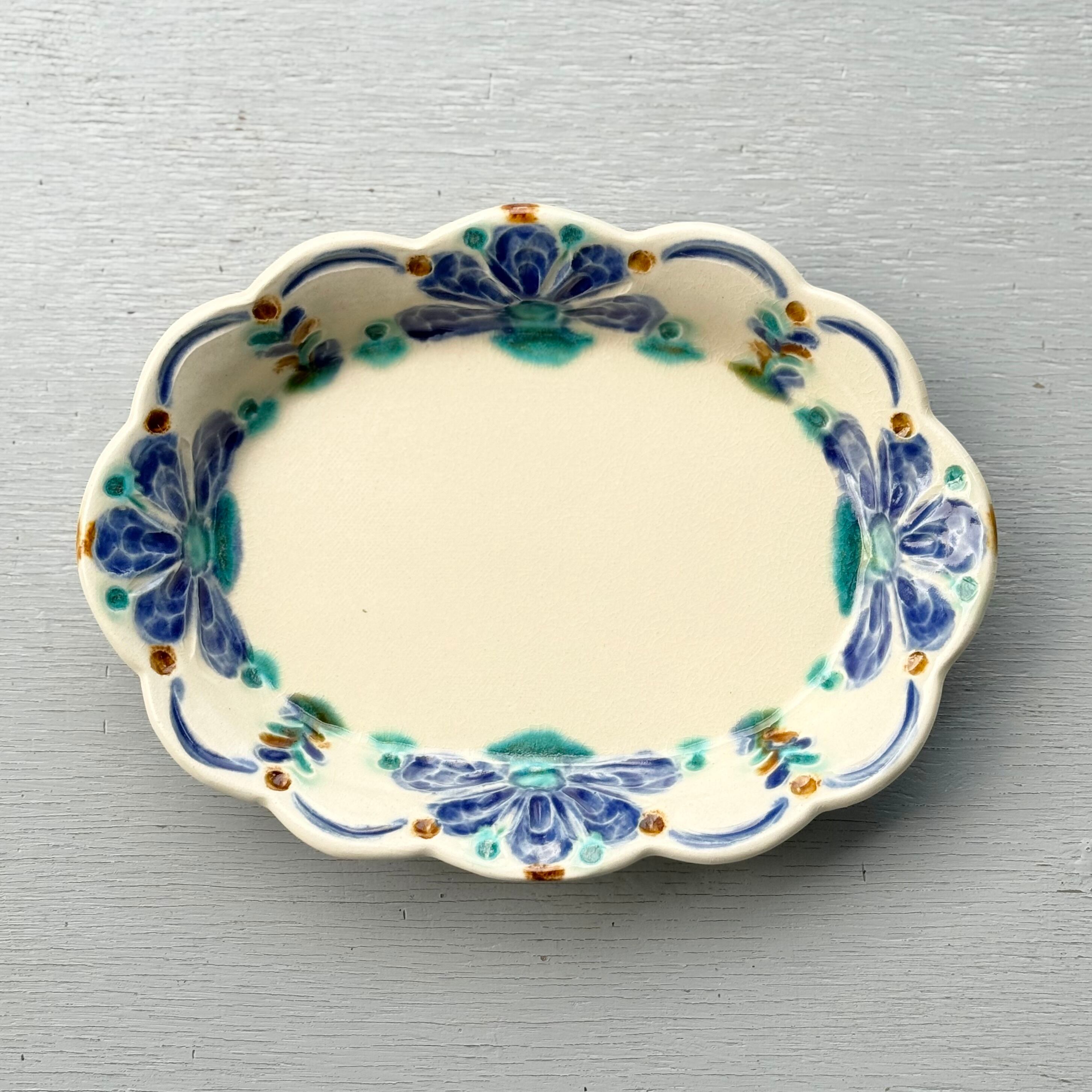 呉須の染付で描いた小さな花紋様が、リースのようにくるりとつながり